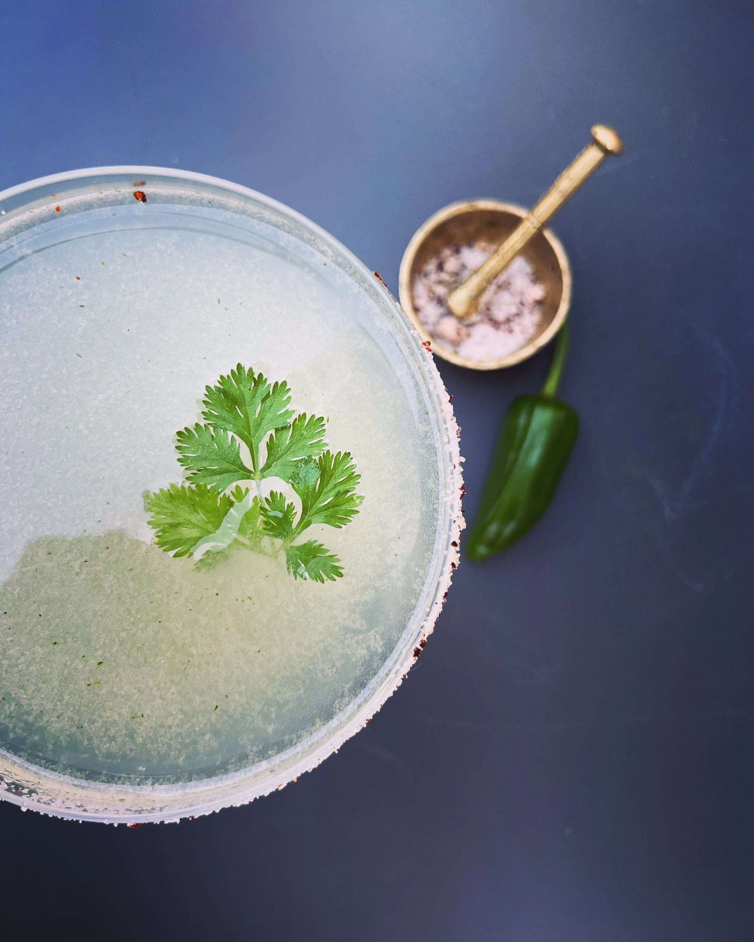 Mezcal, citron vert, coulis ananas / jalapeño, gingembre, sirop de sucre, coriandre fraîche, eau pétillante